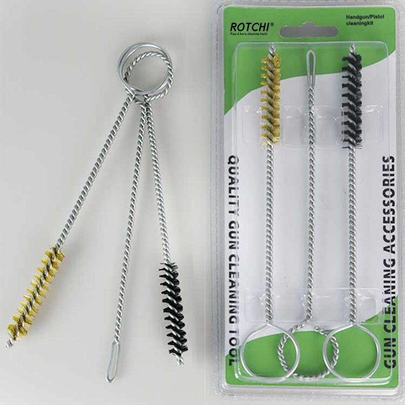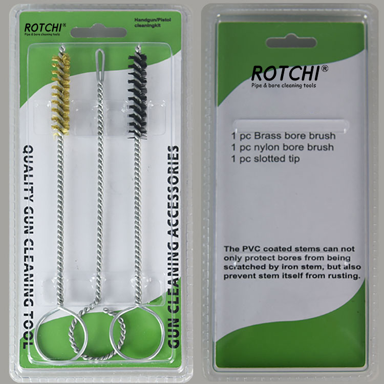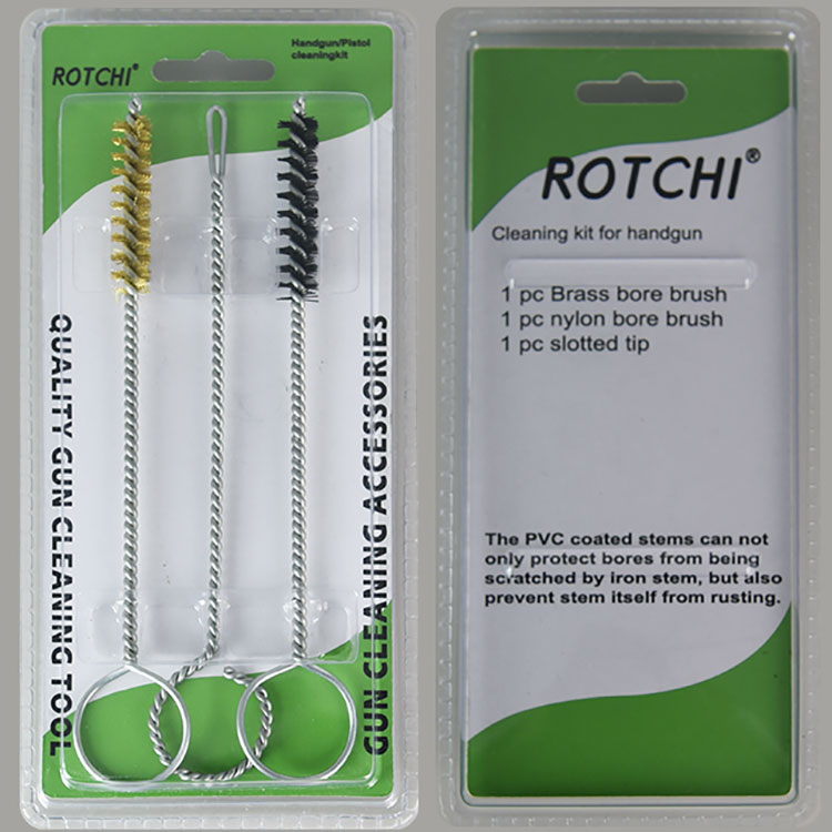 3 ks súprava na čistenie ručnej pištole, balené v dvojitom blistri. Jedna mosadzná kefka na čistenie otvoru, jedna nylonová kefka na čistenie otvoru a jeden štrbinový držiak náplasti. Šikovné a efektívne.