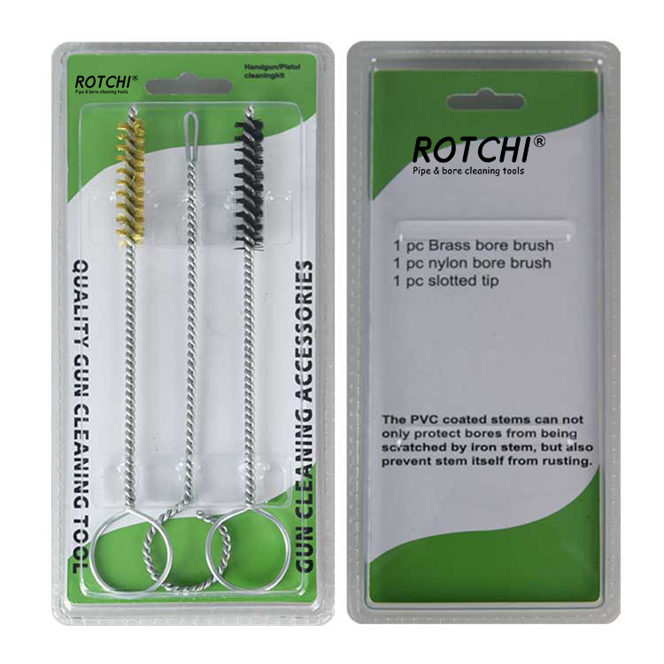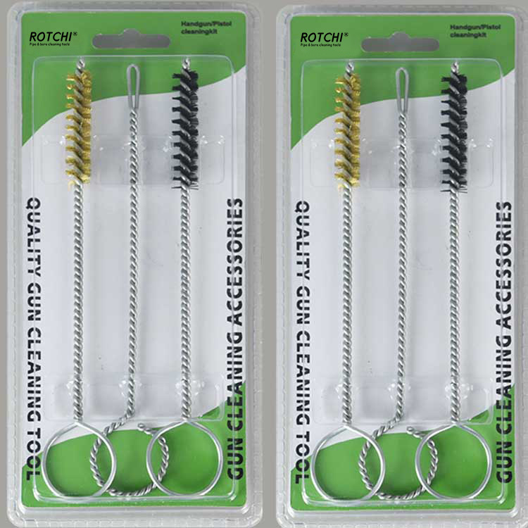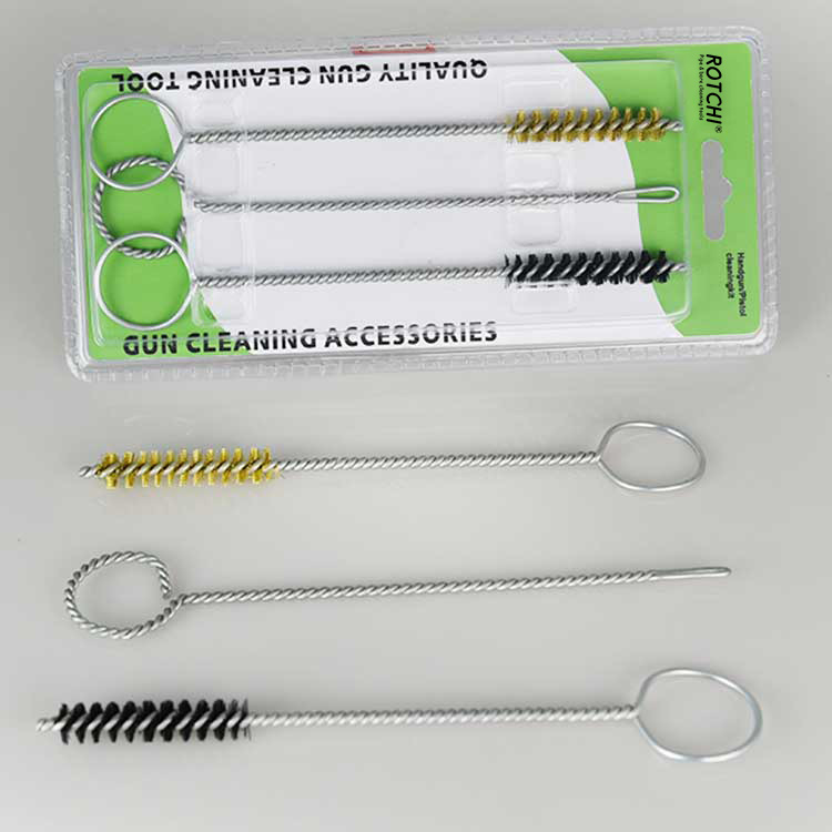 9 mm súprava na čistenie pištole Blistrové balenie 3 ks súprava na čistenie ručnej pištole, balené v dvojitom blistri. Jedna mosadzná kefka na čistenie otvoru, jedna nylonová kefka na čistenie otvoru a jeden štrbinový držiak náplasti. Šikovné a efektívne.