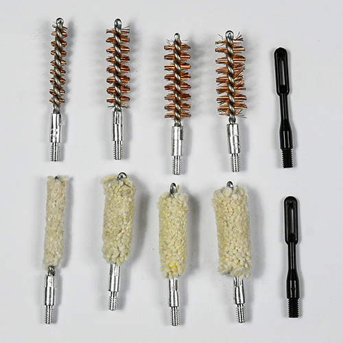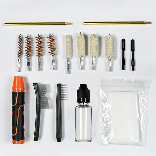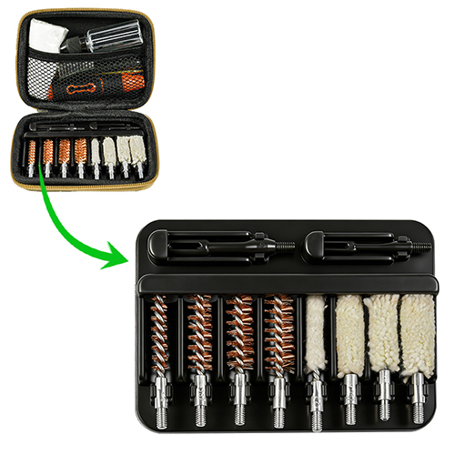 Súprava na čistenie pištole obsahuje 4 veľkosti (.22, 9mm, .40, .45cal.). potiahnutá látkou OX PVC puzdro so zipsom. Mosadzné kefy a bavlnené mopy, 2 tyče. Piesky a čierne farba na výber.