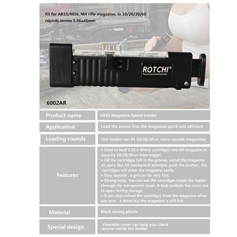Rýchlonakladač zásobníka pre AR15 ● Používa sa na vkladanie nábojov 5,56 x 45 mm do zásobníka AR s kapacitou 10/20/30 alebo viac. ● Naplňte nábojnice do drážky, zásobník nainštalujte na rovnakom princípe ako AR mechanický princíp. zatlačte na posúvač, náboje sa ľahko dostanú do zásobníka. ● Jednoduché ovládanie, dievča to zvládne veľmi rýchlo. ● Silné telo. Cez priehľadný kryt môžete vidieť kazety vo vnútri nakladača. Zámok kontroluje, aby sa kryt počas skladovania neotvoril. ● Môže tiež vybrať nábojnice zo zásobníka, keď nebudete strieľať, ale zásobník je stále plný.