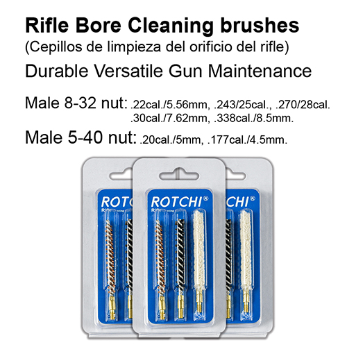 Súprava 3 v 1 kefy na čistenie vývrtu pušky, blister a balenie kariet. Dostupné veľkosti: .177, .22, .25, .27, .30, .338 kal.